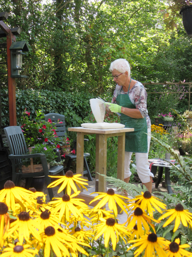 beeldhouwen (aangezet door haar zoon) en er volledig verslingerd aan